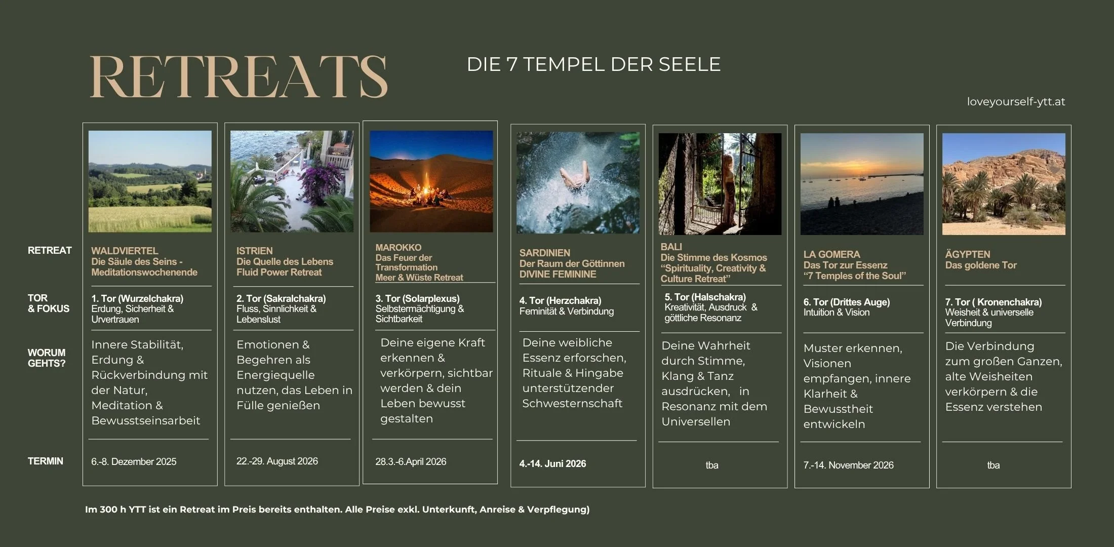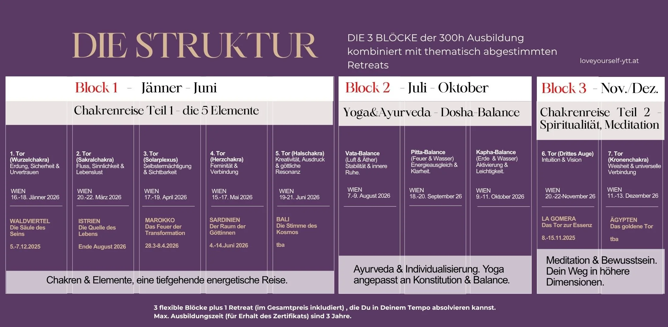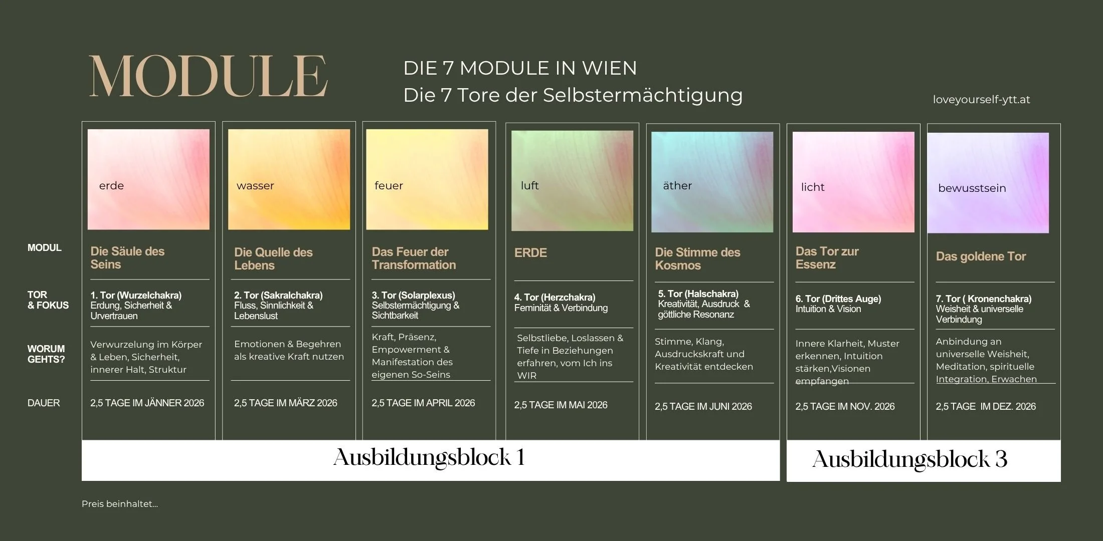 Jedes Retreat ist ein Modul – sowohl die Wochenendretreats in Wien, wie auch die längeren internationalen Retreats. Alles ist miteinander verwoben und ergänzt einander - deine Weiterbildung ist damit keine starre Ausbildung, sondern eine Reise durch die Chakren & Elemente, die Du individuell nach Deinen Interessen gestaltest. Absolviere sie im MiniRetreat in Wien, auf den internationalen Retreats oder hybrid.♥ 3 Blöcke mit jeweils einem klaren Fokus.